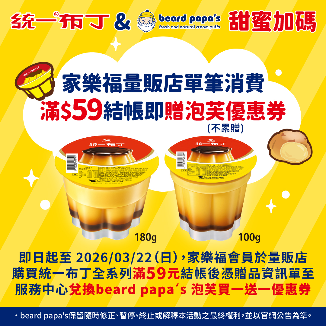 💞2026年3月/4月季節口味💞 🍮經典 統一布丁 入餡,口感香軟綿滑💛 6度推出!家喻戶曉的國民甜點來報到! beard papa’s 於3、4月限時推出「布丁泡芙」,使用經典「統一布丁」入餡,勾起你內心珍貴的回憶。 將beard papa’s經典香草卡士達加入統一布丁混合均勻,擁有綿滑口感的內餡...