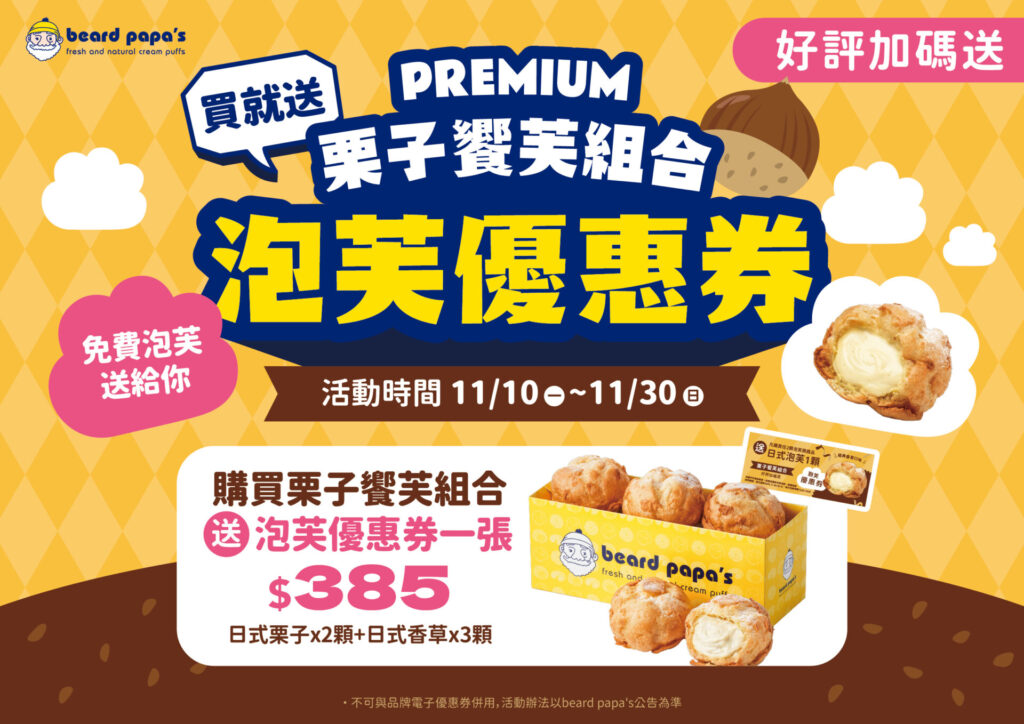💟活動內容:PAPA會員購買栗子饗芙組合,就送泡芙電子優惠券一張!